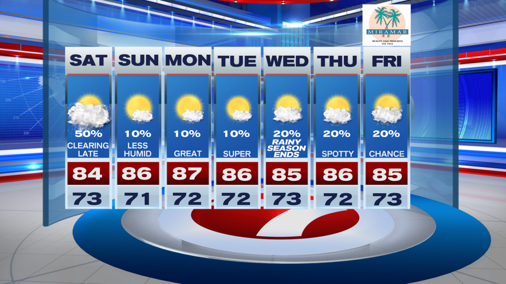 For today, we’re going to deal with lingering clouds and storm chances across South Florida. The highest chances will be south in the Keys, but any storms that develop will bring the threat of heavy rain, lightning, and gusty winds. The extra clouds will keep highs in the mid-80s. We’ll finally see things clear up tonight.