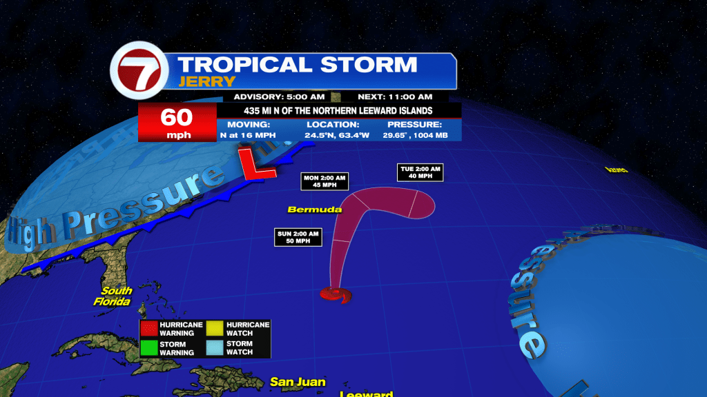 Jerry remains a tropical storm with 60 mph winds this morning. Jerry is forecast to stay well east of Bermuda and is forecast to dissipate by Monday.
