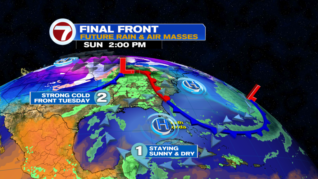 It’s been a beautiful and comfortably warm weekend thus far and that weather trend will continue into our Sunday. Big changes are ahead this week, however, with a prolonged and significant cool down on tap for South Florida to welcome the new year of 2026.