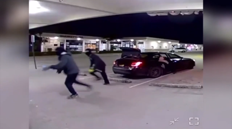 Surveillance video shows a car pulling into the store’s parking lot, then two men quickly opening the trunk and breaking into the store.