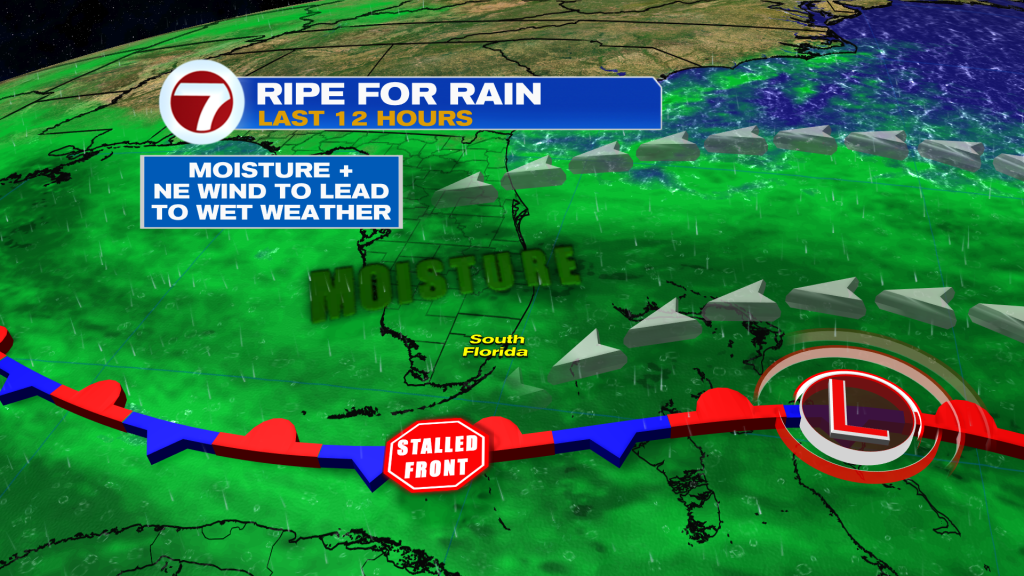 The reason for this soggy pattern is a front stalled out near South Florida. That is trapping moisture while a robust wind out of the northeast will be in place Friday. These ingredients often lead to showery weather conditions.