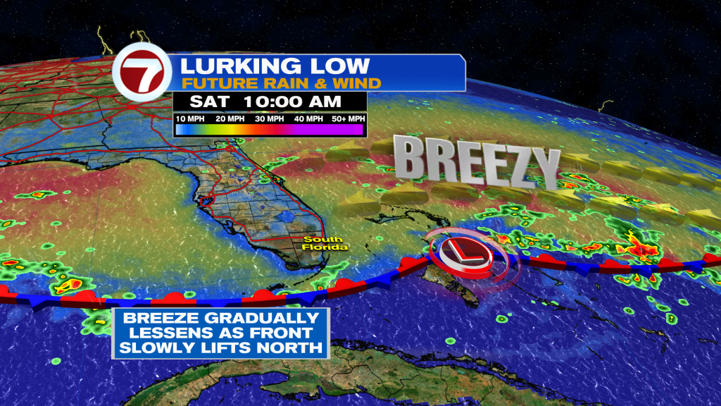 By next week, the front will remain nearby, keeping moisture levels elevated while the breeze is expected to increase once again, especially over the midweek time frame. Therefore, the daily chance for scattered showers and storms will remain in the forecast.