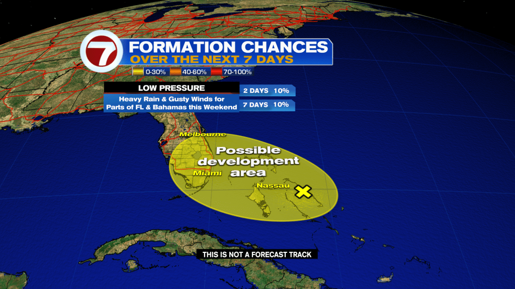 That includes an area of low pressure that has formed over the central Bahamas that has a low, 10% chance of forming as it travels northwest toward central Florida. This low is forecast to track near or over Florida by the end of the weekend, aiding in the wet and gusty weather pattern.
