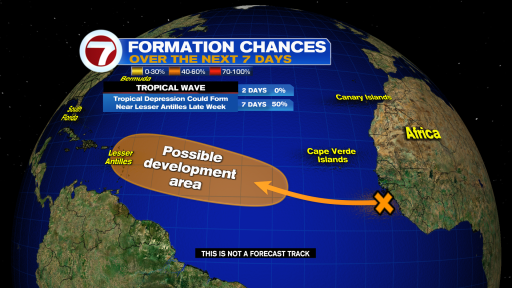 Farther east, there’s a tropical wave moving off from Africa with a medium, 50% chance of developing within the next 7 days. The Lesser Antilles should monitor for possible impacts by around next weekend depending on this potential system’s future track.