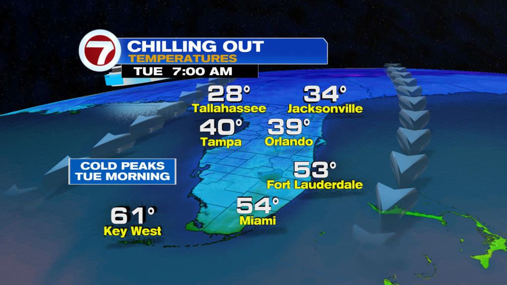 It’s not until Tuesday when the cold air seeps into South Florida. Widespread lows Tuesday morning will be in the low to mid 50s while feels-like temperatures given the aforementioned wind will generally be down to the 40s!