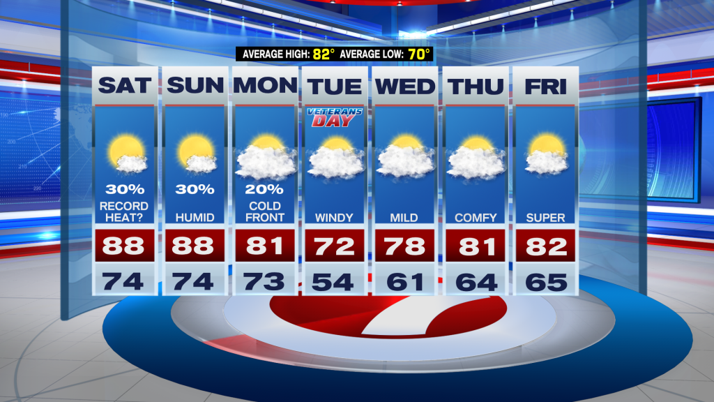 That will dramatically change come Monday as winds will ramp up as the day rolls on while the cold front crosses through during the morning and midday hours. Based off the latest timing of this front, it will still be rather warm with highs in the low 80s but a notable difference versus how it will be over the weekend. Humidity will also plummet throughout the day Monday.
